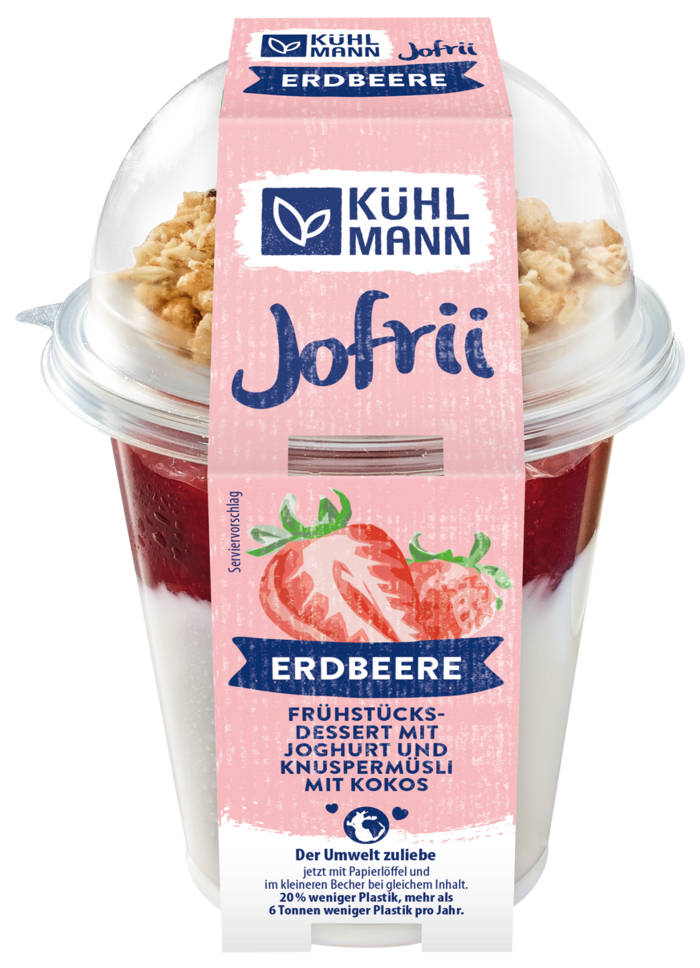Dessert mit Erdbeeren (91 %) (Joghurt 62 %, Erdbeeren 20 %, Zucker, modifizierte Stärke, Milcheiweißerzeugnis, Zitronensaftkonzentrat, färbendes Rote-Bete-Saftkonzentrat, Stärke, Verdickungsmittel: Pektin, Vanilleschotenpulver extrahiert), Knuspermüsli (9 %) (Hafervollkornflocken 5 %, Zucker, Sonnenblumenöl, Kokosraspel 0,4 %, Glukose-Fruktose-Sirup, Reis-Weizen-Extrudat (Reismehl, Zucker, Weizenprotein, Gerstenmalzmehl, Weizenmalzmehl, Speisesalz), Speisesalz, Antioxidationsmittel: stark tocopherolhaltige Extrakte).
