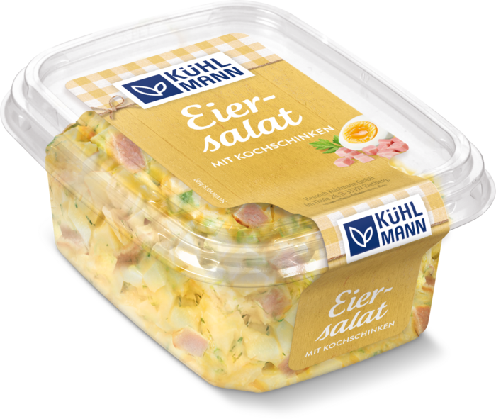 Eier* 44 %, Rapsöl, Trinkwasser, Kochschinken 8 % (Schweinefleisch, Nitritpökelsalz (Speisesalz, Konservierungsstoff: Natriumnitrit), Dextrose, Gewürze, Antioxidationsmittel: Natriumisoascorbat, Stabilisator: Natriumacetate, Natriumcitrate), Zucker, Eigelb*, Branntweinessig, Stärke, Weißweinessig, Speisesalz, färbendes Karottenkonzentrat, Senfsaaten, Kräuter, Gewürze, Maltodextrin, Rauch, Verdickungsmittel: Guarkernmehl, Säureregulator: Natriumacetate, Konservierungsstoff: Kaliumsorbat.