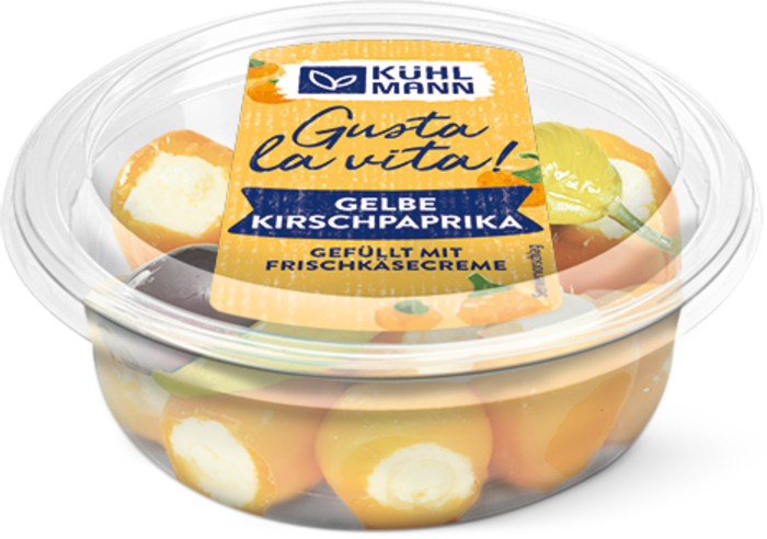 Kirschpaprika 52 %, Frischkäse 36 %, Oliven geschwärzt 4 % (grüne Oliven, Speisesalz, Stabilisator: Eisen(II)-gluconat; Säuerungsmittel: Milchsäure), grüne Peperoni 4 %, Rapsöl, Branntweinessig, Stärke, Zucker, Speisesalz, Säuerungsmittel: Citronensäure, Essigsäure; Festigungsmittel: Calciumchlorid.