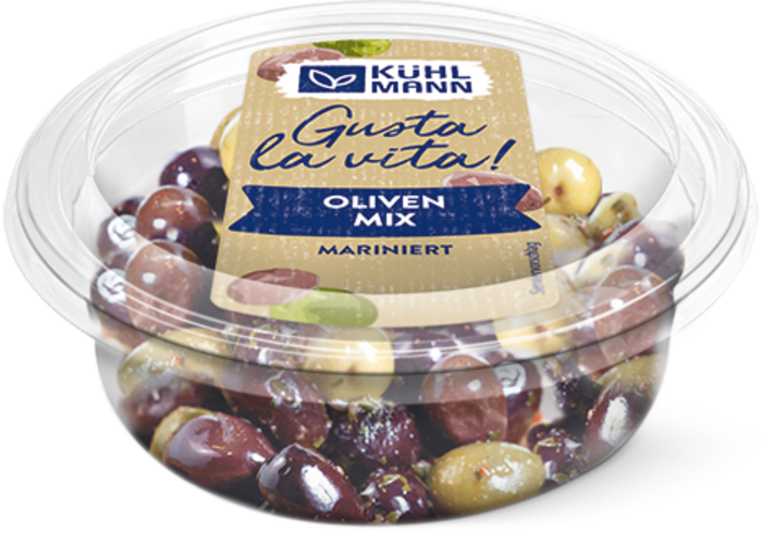 Gemüse in veränderlichen Gewichtsanteilen 88 % (Kalamata Oliven ohne Stein, grüne Oliven Nocellara del Belice, grüne Oliven), Rapsöl, Branntweinessig, Paprika, Speisesalz, Gewürze, Antioxidationsmittel: Ascorbinsäure, Säuerungsmittel: Citronensäure, Milchsäure.