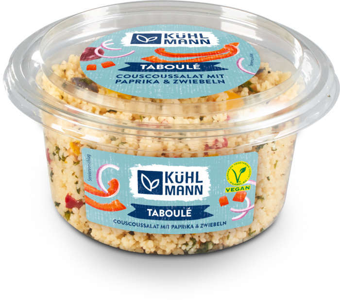 Couscous gequollen 58 % (Hartweizengrieß, Trinkwasser), Paprika 12 %, Rapsöl, Kichererbsen, Zwiebeln 5 %, Petersilie 3 %, Zucker, Apfelessig, Speisesalz, Zitronenschale, Schwarzkümmel, Gewürze, Minze, Branntweinessig, Säureregulator: Natriumacetate, Konservierungsstoff: Kaliumsorbat.