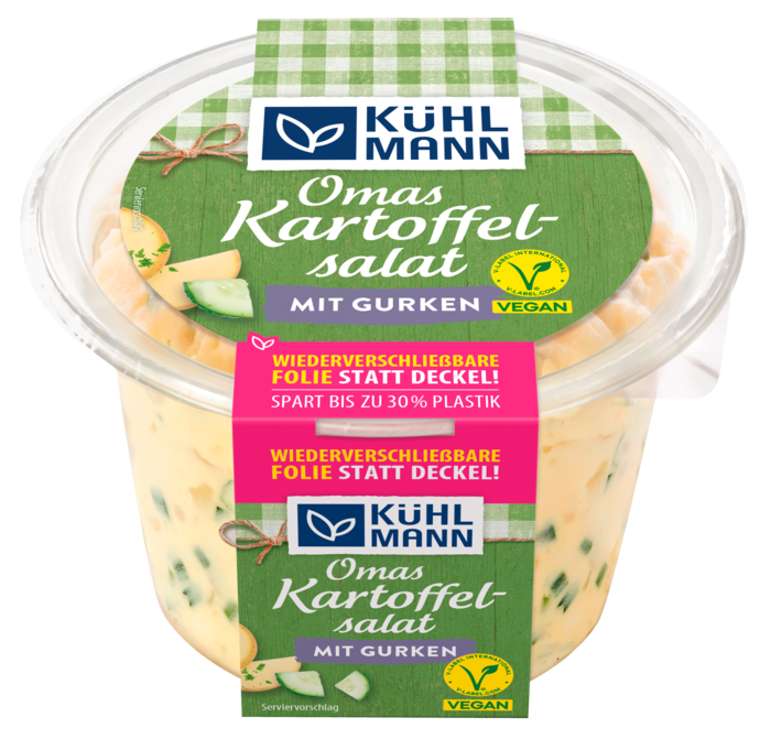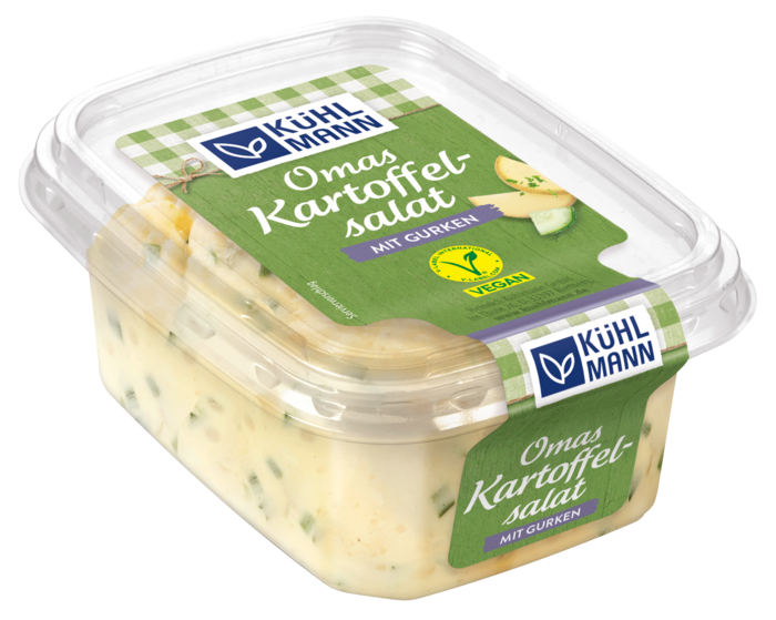 Kartoffeln 60 %, Trinkwasser, Rapsöl, Gurken 7 %, Zucker, Branntweinessig, Zwiebeln, modifizierte Stärke, jodiertes Speisesalz (Speisesalz, Kaliumjodat), Speisesalz, Kräuter, Stärke, Gewürze, Verdickungsmittel: Guarkernmehl, Xanthan; Säureregulator: Natriumacetate.